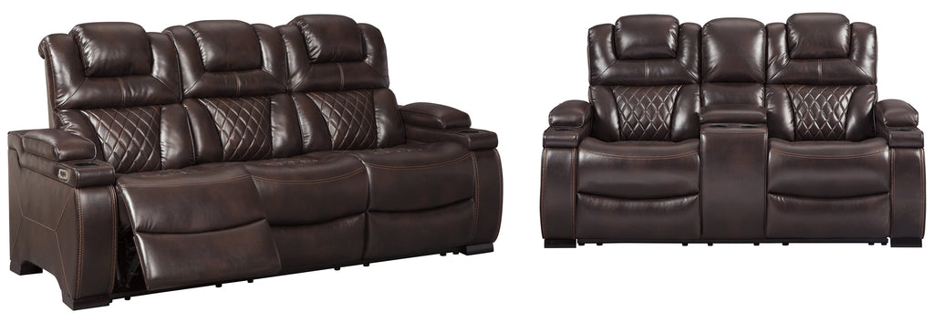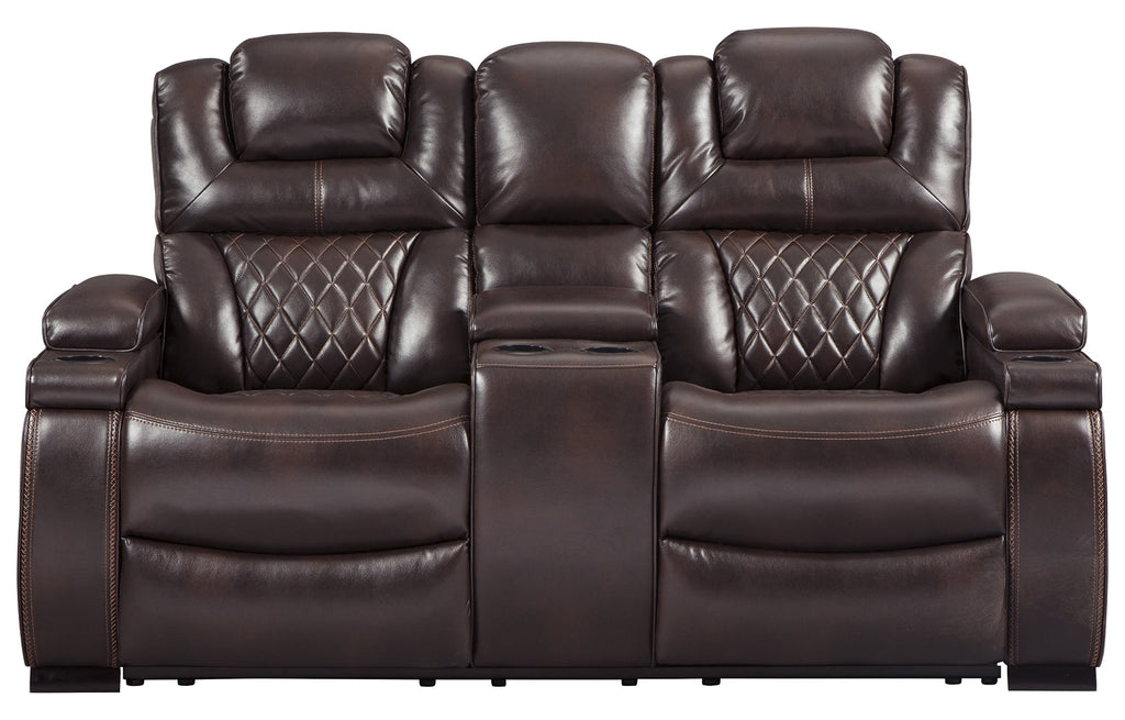 Your modern living room awaits with this power reclining sofa and power reclining loveseat with console. Complete with practical faux leather upholstery, one-touch power controls, adjustable headrests and USB ports, this living room set makes finding the best seat in the house a breeze. Cup holders and a storage console keep drinks, snacks and remotes close by. What a perk that the sofa’s center seat is crafted with a drop-down table with power/USB plug-ins and dual cup holders. Go ahead—treat yourself to a high-design home theater experience, priced to put you at ease.