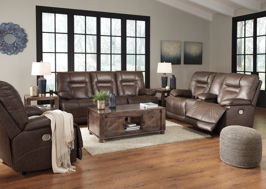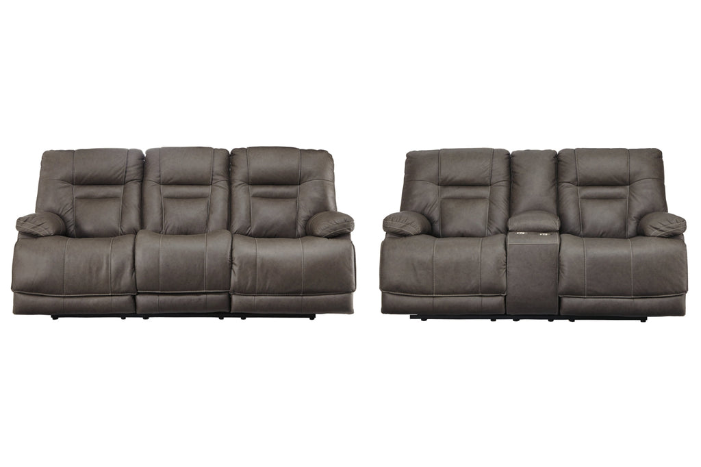 Big and bold, this two-piece power package includes a power reclining sofa and power reclining loveseat with console. Both feature Easy View™ power adjustable headrests for maximum comfort at the touch of a button; easily position the recliner, its headrest and lumbar support to your liking. Convenient USB ports let you charge cell phones or laptops without getting up. The look and feel of genuine leather surrounds you in the cushioned seat, interior bustled back cushioning and pillow top armrest, while faux leather back and sides allow affordability. Ideal for a modern or casual setting, the smoke-colored upholstery has an effect that creates a rustic look.