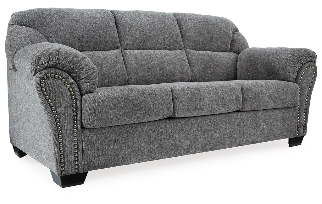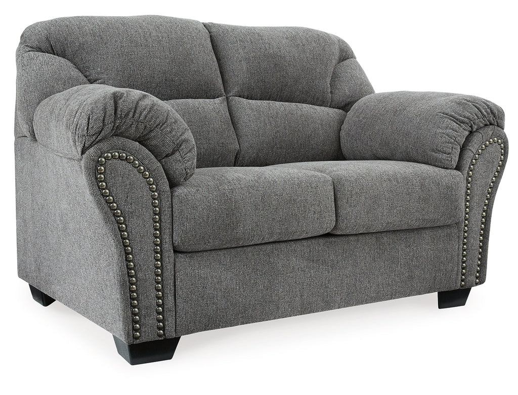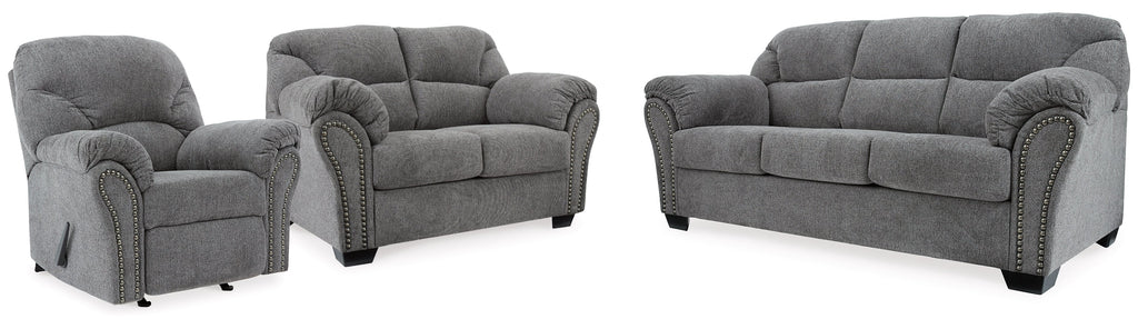 Why sacrifice comfort for style (or style for comfort) when you can have the best of both in this living room set with sofa, loveseat and rocker recliner in pewter gray. Elements include a chic divided-back design and pillow top wrapped armrests that make nodding off all too easy. Calling attention to the elegantly flared armrests—black nickel-tone nailhead trim for a punch of cool character.