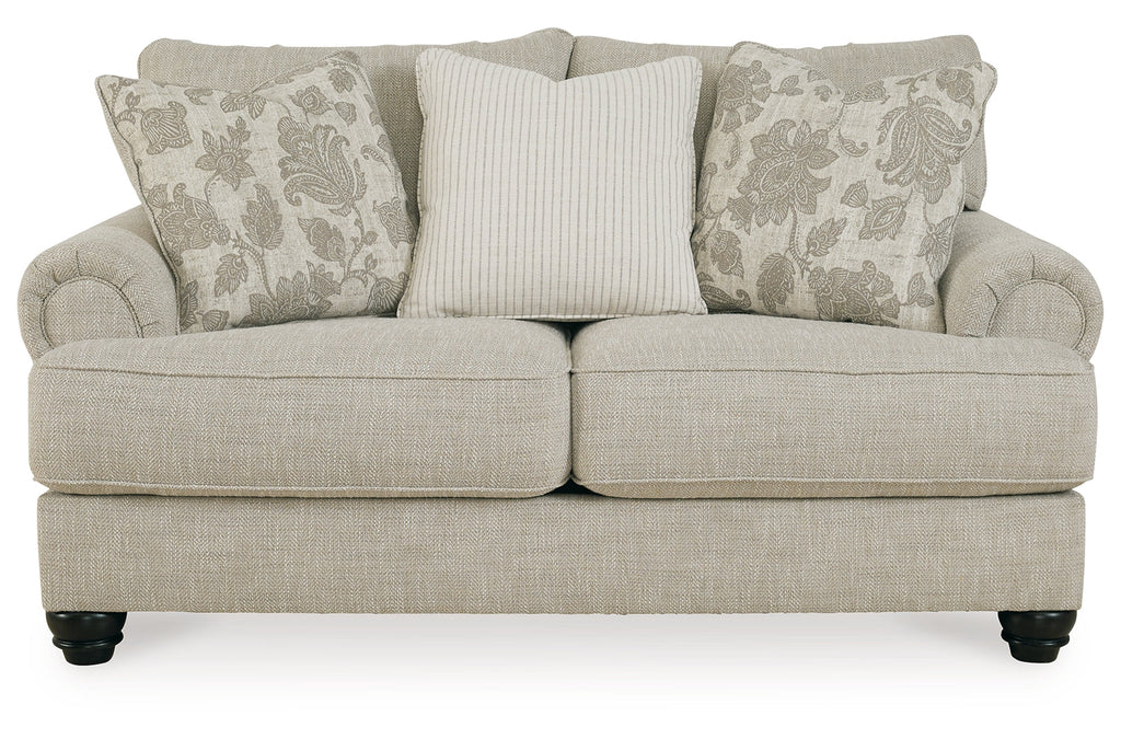 This sofa and loveseat package has an alluring look that's guaranteed to turn heads. Richly textured fabric in a light, easygoing hue is enhanced by even lighter flax peeking through. Distinctive roll arms add a dab of debonair, while indulgently plush cushions cradle you softly. Sit back and relax in comfort and style, with plenty of room to stretch out and unwind at the end of a long day.
