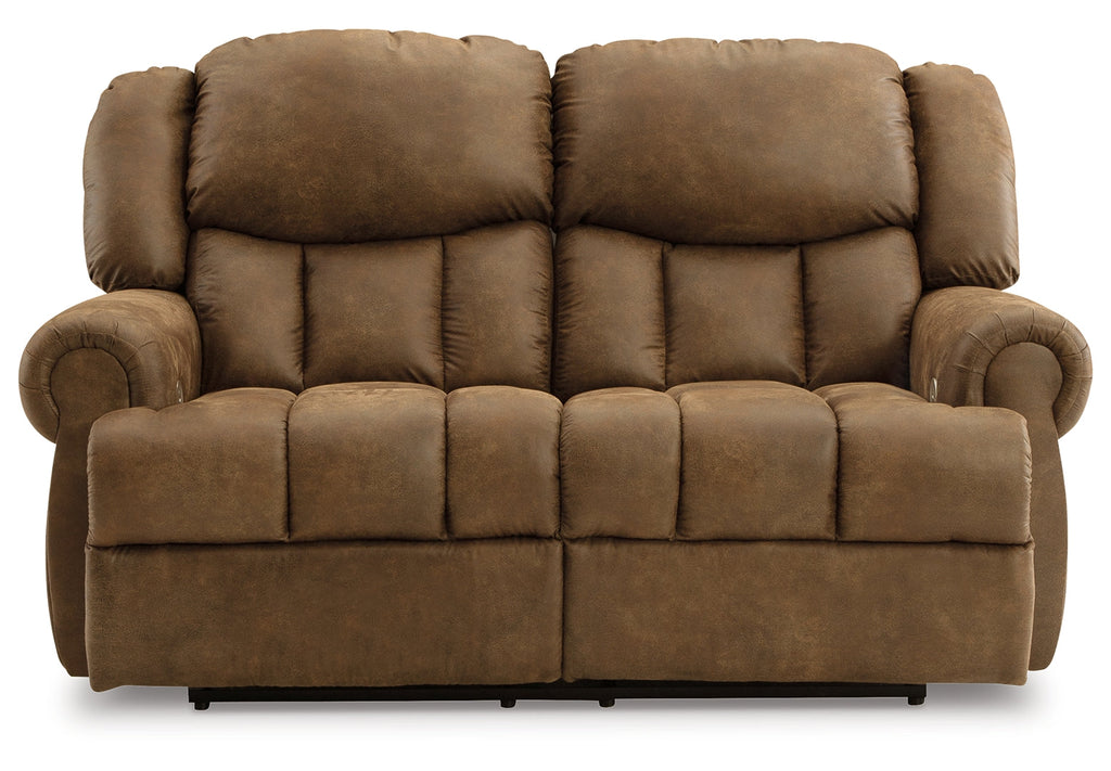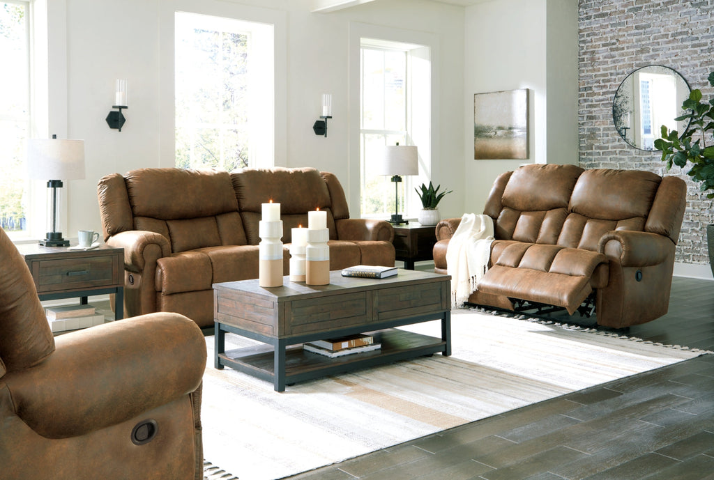 Expansive elegance. This reclining seating package makes a sizable style statement. Each piece's large scale enhances the luxe appearance, magnifying the beauty of richly warm brown faux leather. Polishing off the set is an effortless reclining motion, which adds a layer of function to this masterclass in form.