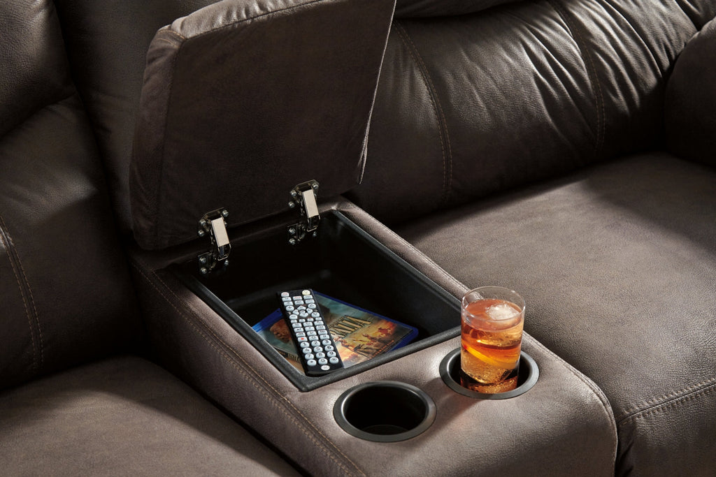 Rock the cool look of leather minus the hefty price tag with this 2-piece reclining living room set. Rich with tonal variation, this set—which includes a reclining sofa and a double reclining loveseat with console—is covered in indulgently soft faux leather upholstery that looks like the real thing. And talk about over-the-top comfort. Double stuffed armrests and sumptuous cushions cradle and support in all the right places. Distinctive scooped stitching enhances this reclining set’s contemporary flair.
