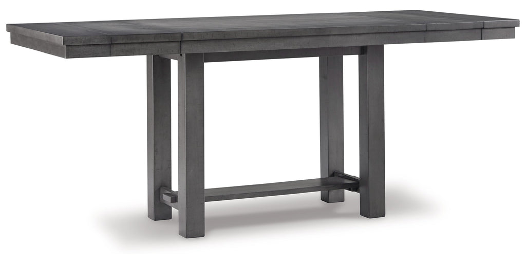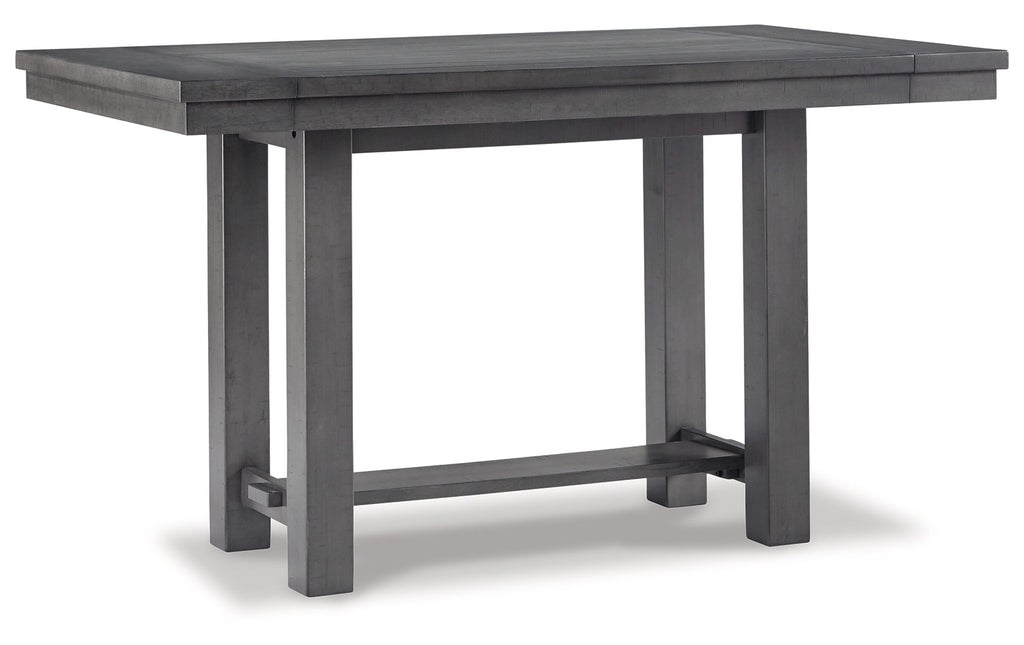 Going gray in the best possible way. This counter height dining table wows with an utterly on-trend smoky gray finish and plank styling. Easy-on extension leaves attach at either end of the table for family dinners or impromptu entertaining. Just a touch of distressing helps it fit right in with your modern farmhouse decor.