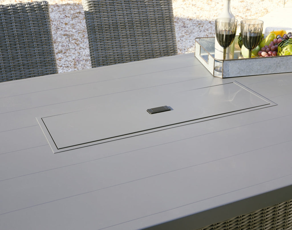 Turn your backyard into a hotspot for entertaining with this bar table with fire pit. Sporting a neutral gray finish, the rectangular table elevates the art of al fresco living. Its chic aluminum frame is paired with all-weather resin wicker for beauty and brawn. This outdoor table is enhanced with glass beads that add a dramatic element. Hidden storage shelves and a protective weather cover keep everything ready and waiting for impromptu entertaining.