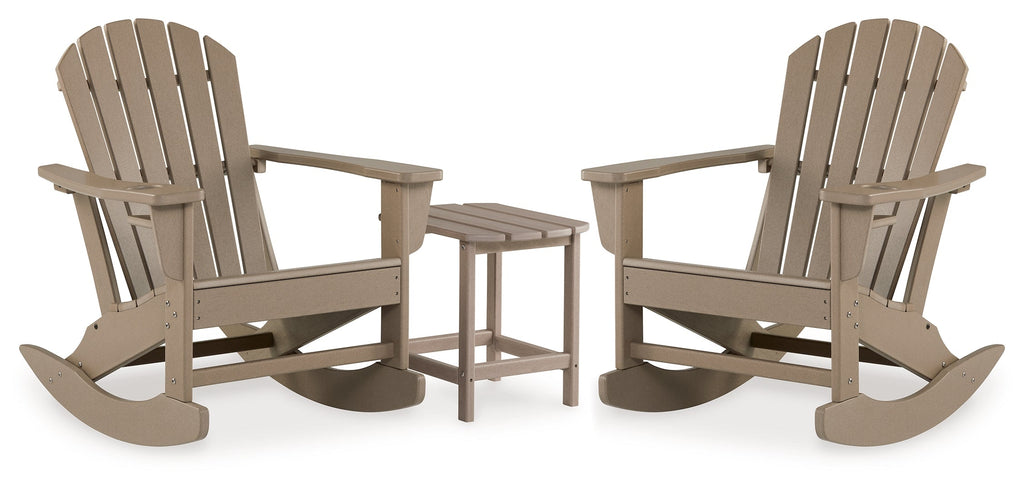 Add cottage-quaint charm to your outdoor oasis with this rocking chair and table set. Made of MEGA TUFF™ high-density polyethylene material, it’s sure to weather the seasons beautifully. Designed to shed rainwater, the slatted styling and classic Adirondack design provide exceptional form and function.