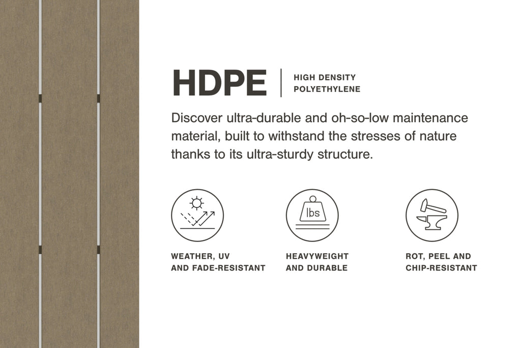 - MEGA TUFF™ HDPE surfaces are made of high-density polyethylene, which gives the wood look you love and the weather resistance you crave