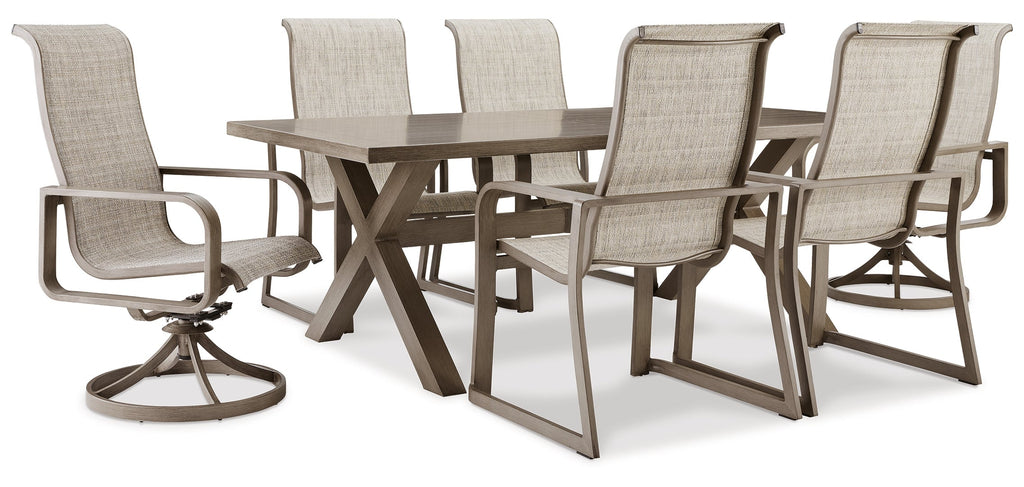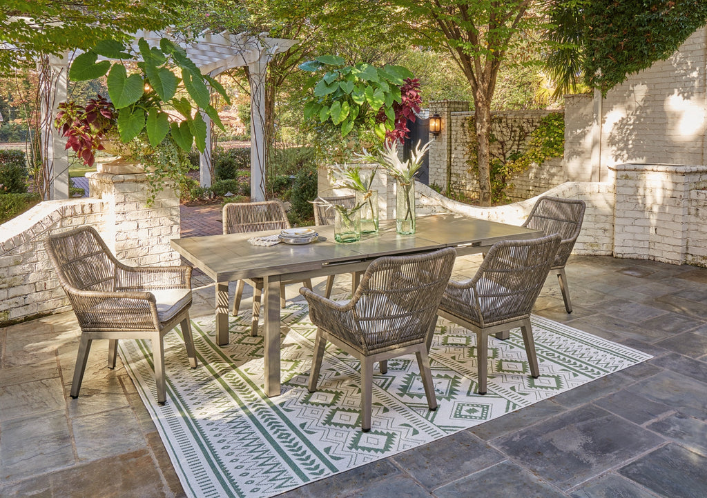 Balancing effortless natural beauty and minimalist design, this dining package seamlessly brings your contemporary style outdoors. Sporting a wood-look finish, it entices with its striking linear forms and neutral sling fabric. Sleek yet durably made, this set refines the art of relaxed outdoor living.
