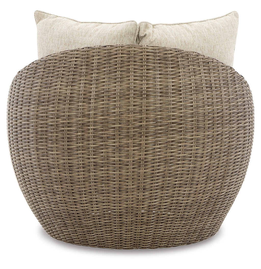 This swivel lounge chair completes your outdoor seating area with its fresh take on casual comfort. Handwoven resin wicker over a curving aluminum frame balances streamlined style and exceptional durability. High-performance beige Nuvella+™ fabric wraps the seat and back cushions, protecting against the natural elements.