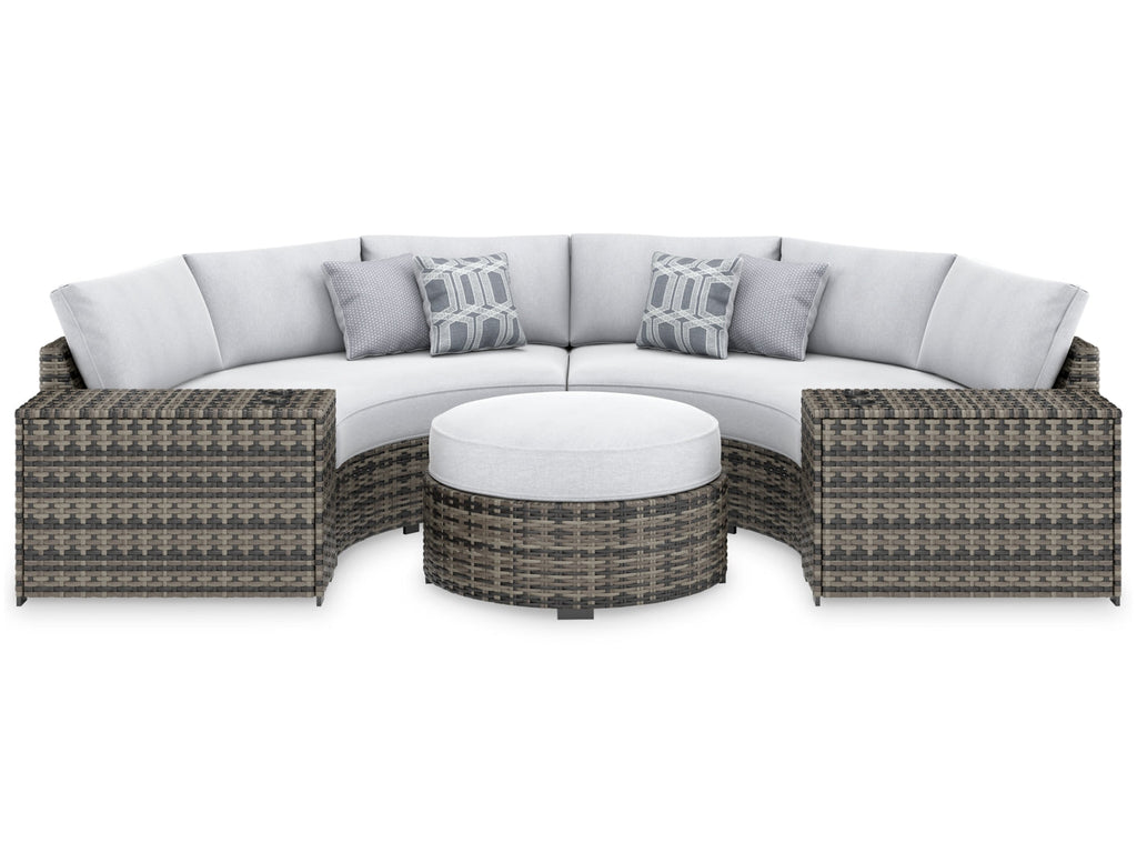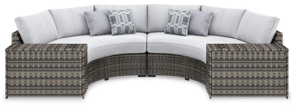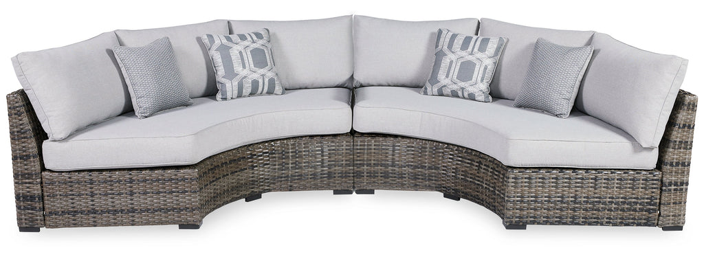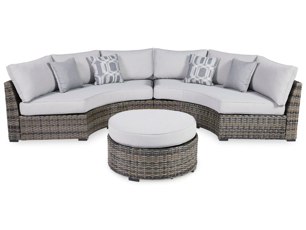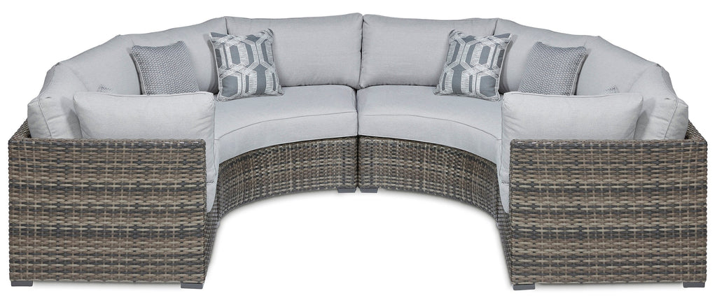 This cool, casual sectional raises the comfort level and visual appeal of your outdoor living space. Made of handwoven wicker in neutral tones of light and dark gray, the pieces blend beautifully into your lanai or pool and patio area. Thick, comfy cushions are wrapped in Nuvella® high-performance fabric that is stain resistant, fade resistant and easy to clean. Throw pillows add comfort and a splash of color.