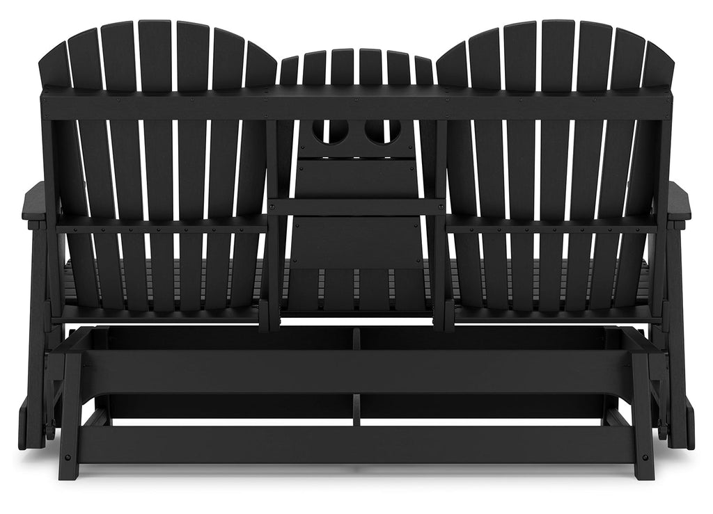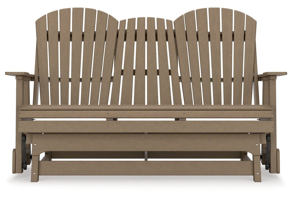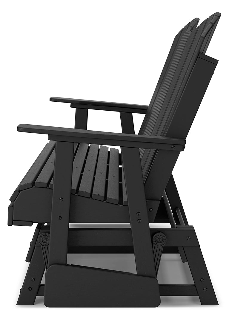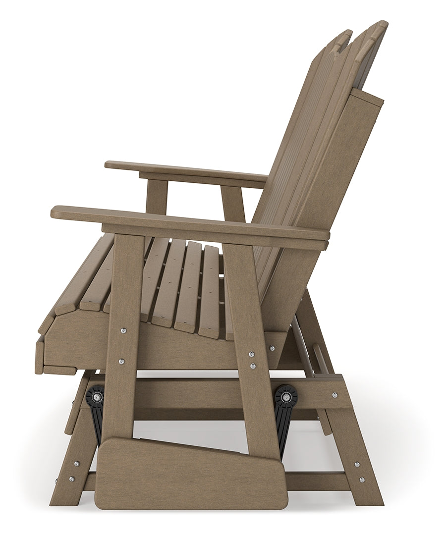Drift away from everyday worries and into outdoor bliss with this glider loveseat. Dressed in an inviting driftwood hue, the Adirondack-inspired design has a classic feel. It weathers sunny summer days and cozy winter nights with durable MEGA TUFF™ HDPE material. A drop-down console with integrated cup holders keeps refreshments and snacks within easy reach. With the console snapped into the back, this loveseat has even more room for enjoying lazy days in the shade.