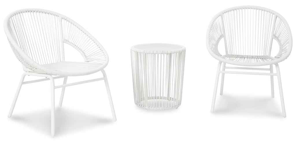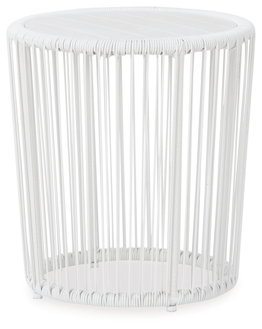 Treat yourself to trend-right outdoor design with this table and chair set. It elevates your patio, deck or poolside seating area with sleek white resin wicker over a durable powder coated steel frame. The included end table with an aluminum top keeps your essentials for everyday relaxation within reach.
