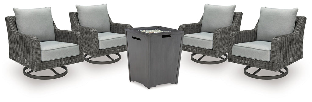 Sporting a hand-painted gray wood-look finish for a sense of earthy elegance, this fire pit table is sure to turn your backyard space into a hot spot for entertaining. The way its flickering flame seems to float on a bed of clear glass beads is truly mesmerizing. The resin wicker swivel chairs, with thick seat and back cushions wrapped in Nuvella® high-performance fabric, will weather the seasons beautifully.