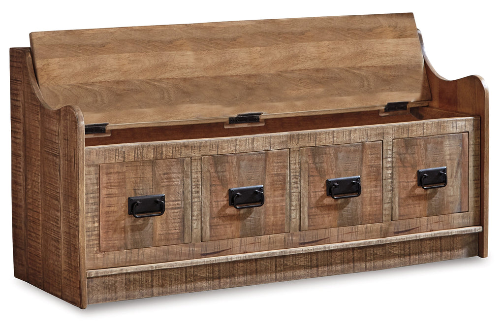 Load up on vintage charm with this solid wood accent bench. Sporting faux drawer fronts adorned with black bail pulls, this handy-dandy bench includes a hinged seat revealing underlying storage. What a quaint choice for an entryway or mudroom.