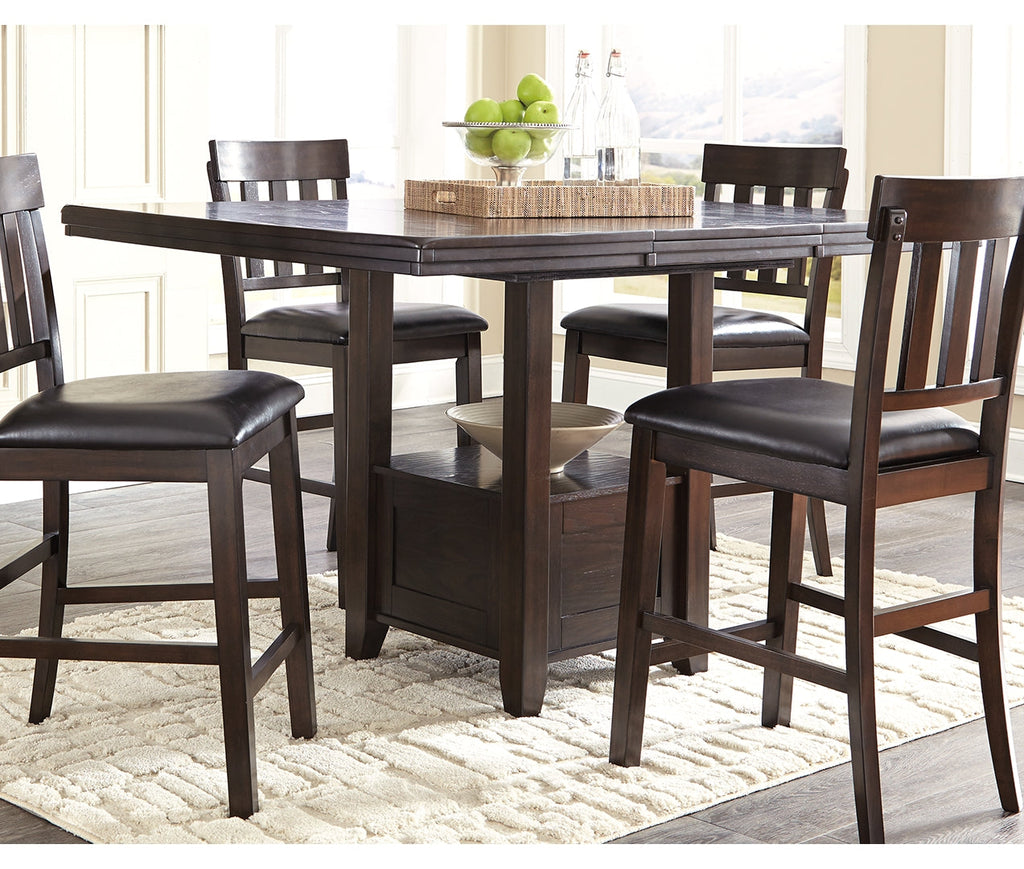 Modern sophistication, beautifully served. This counter height extension table raises the bar with a simply striking design and rich, dark finish. Removable leaf stretches the possibilities. Built-in shelf stacks up as additional storage space.