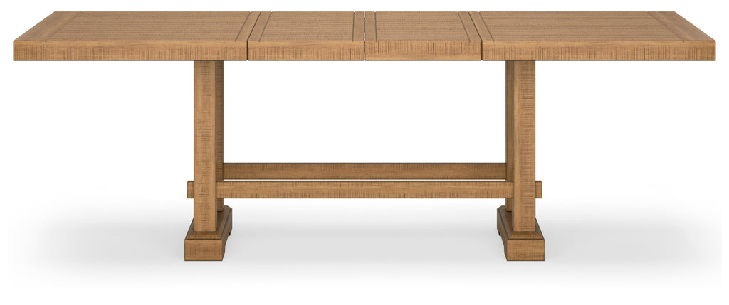 This counter height dining table is a favorite for casual rustic interiors. Offering plenty of seating space, it’s your answer for everyday living and impromptu guests. And the distressed pine finish, double trestle base and two extension leaves? Deliciously charming and versatile.