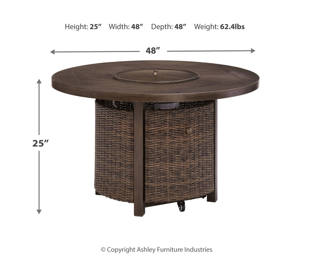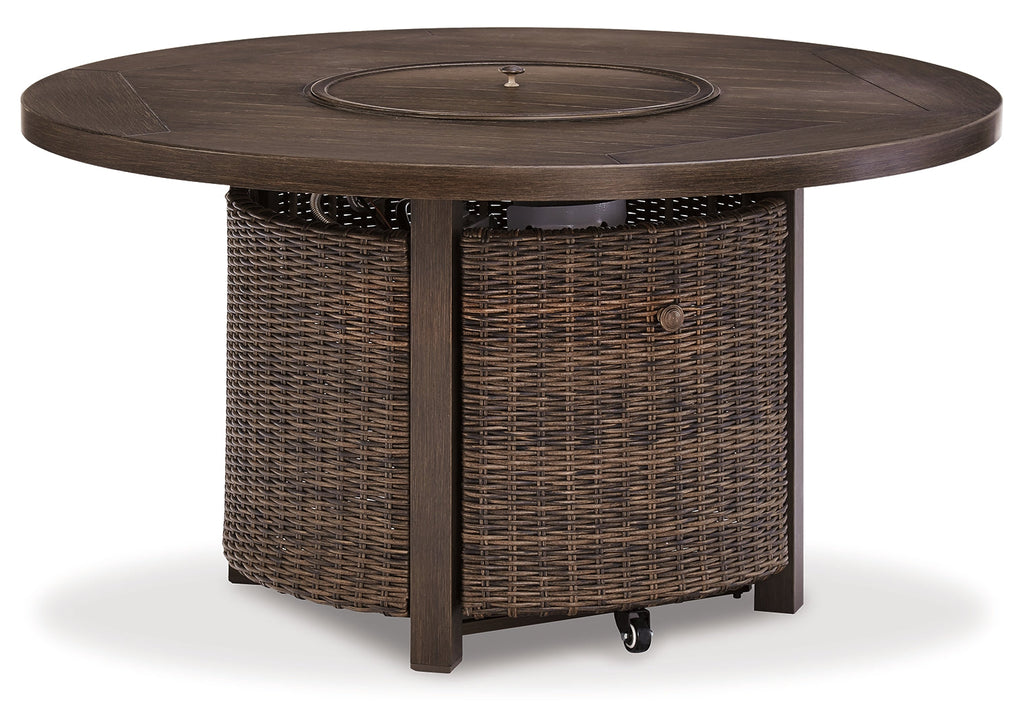 Turn your backyard space into your own piece of paradise with the Paradise Trail outdoor table with fire pit. Though this outdoor table looks remarkably like wood, it’s made of sturdy, rust-proof aluminum that’s perfectly suited for alfresco living. Enhancing the rustically refined aesthetic: side panels accented with all-weather, handwoven resin wicker. The result may look high maintenance, but rest assured, this outdoor fire pit table is anything but. With the press of a button, ignite a flickering flame that dances over a bed of glass beads. And with room for up to eight, it’s one highly accommodating outdoor bar table.