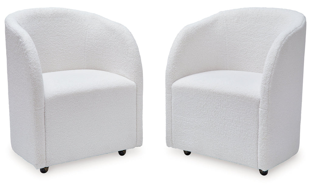 Inspired by art deco design, this fully upholstered dining chair makes a lasting impression in a simply stunning way. Its magnificent curved silhouette is enhanced with a neutral boucle upholstery that’s so pleasing to the palate. This is the piece you’ve been looking for to elevate your contemporary decor whether you’re dining, listening to your latest playlist or binge-watching with friends. Plus, it’s set on casters so it’s easy to move around.
