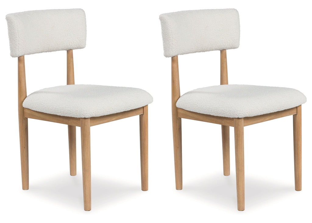 Clean lines meet cool curves with this dining chair. Simple round post legs and a natural finish lend a modern vibe, while softly textured upholstery tempts you to sit and stay awhile. What a delicious choice for a dining room update.