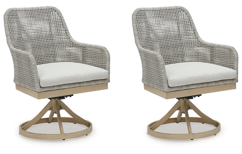 This swivel dining chair invites your casual contemporary style outdoors. With its resin wicker in a chic neutral hue, it expertly marries refined design with durability. The chair's 360-degree swivel makes it easy to switch from watching the kids at the pool to grabbing a drink from the table. And breezy summer mornings and cold winter nights are made all the more comfortable with high-performance Nuvella+ fabric covering the seat cushion.