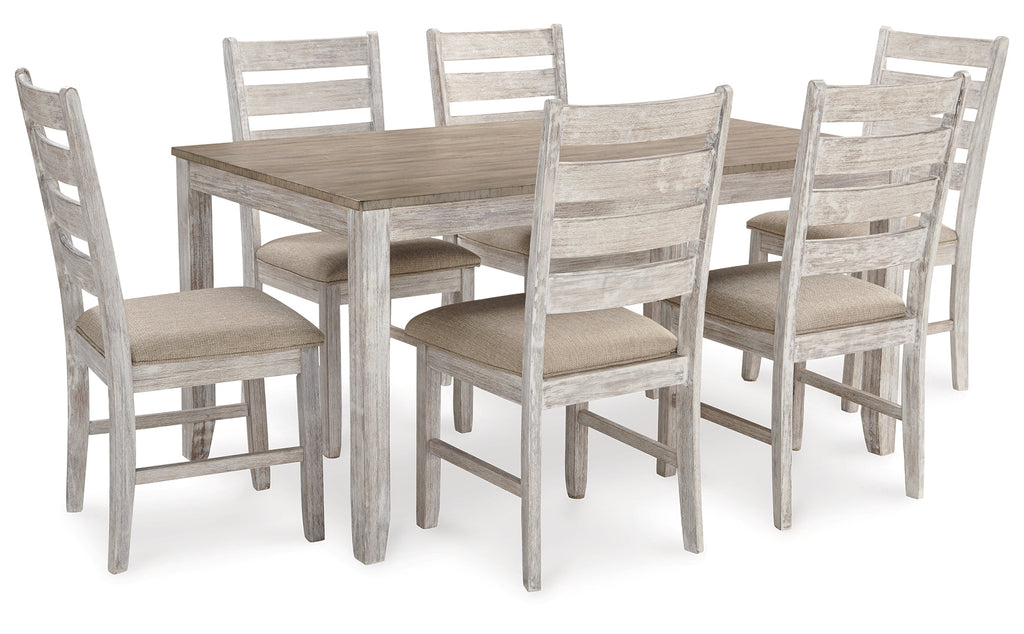 Set the scene for coastal chic or modern farmhouse living with this dining room table set. Clean-lined, simply striking table doubles the charm with a brown tone top with plank effect, paired with a grayish white base with rub through effect for timeworn appeal. Six chairs with classic ladderback styling and comfortably upholstered seats make room for one and all.