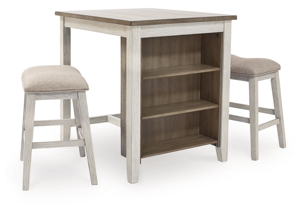 This clever counter height table and bar stool set invites you to raise the bar on small space living. An inspired choice for coastal chic or modern farmhouse settings, this clean-lined, simply striking set doubles the charm with brown tone plank effect tops, paired with grayish white bases with rub through effect for timeworn appeal. The table’s built-in open shelves make the most of every inch of space.