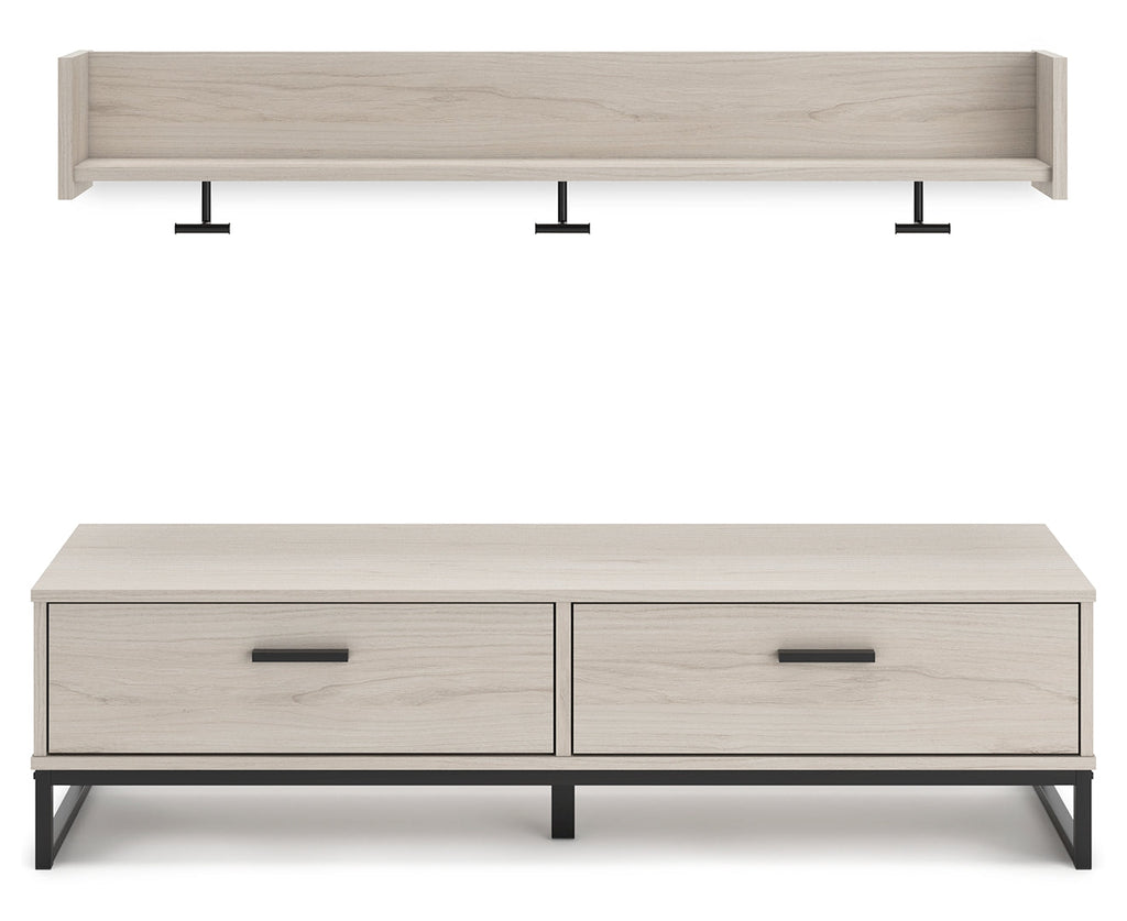 Spruce up your entryway or mudroom with this streamlined storage bench with coat rack. Spacious drawers in the bench, together with sturdy hooks and an open shelf on the wall-mounted coat rack, are your new go-to spot for hats, scarves and outdoor gear. Contemporary handles and sled-style legs with a dark pewter-tone finish emphasize the sleek, contemporary profile. Whether by the front door or back entry, this set keeps all-weather essentials well within reach.