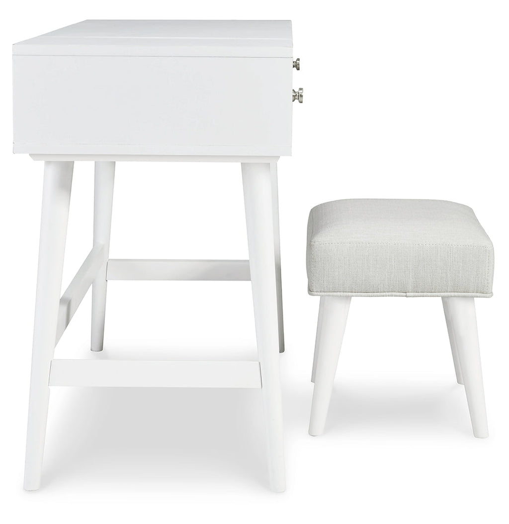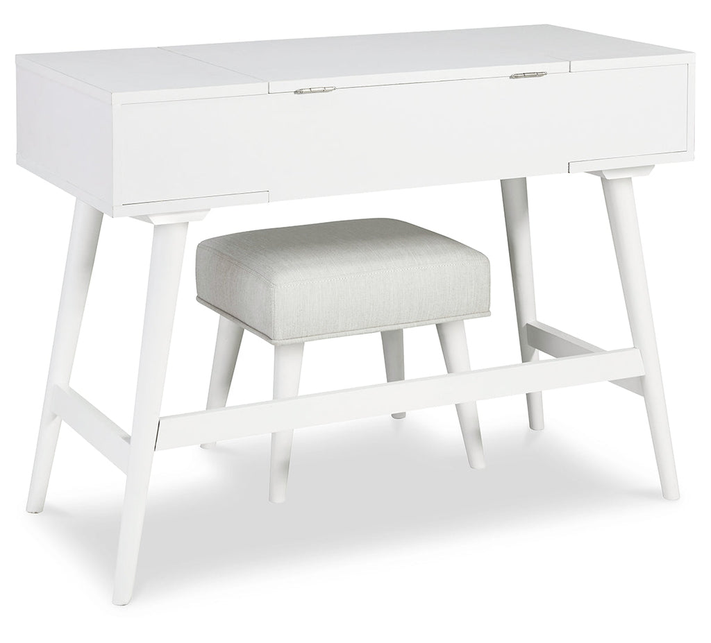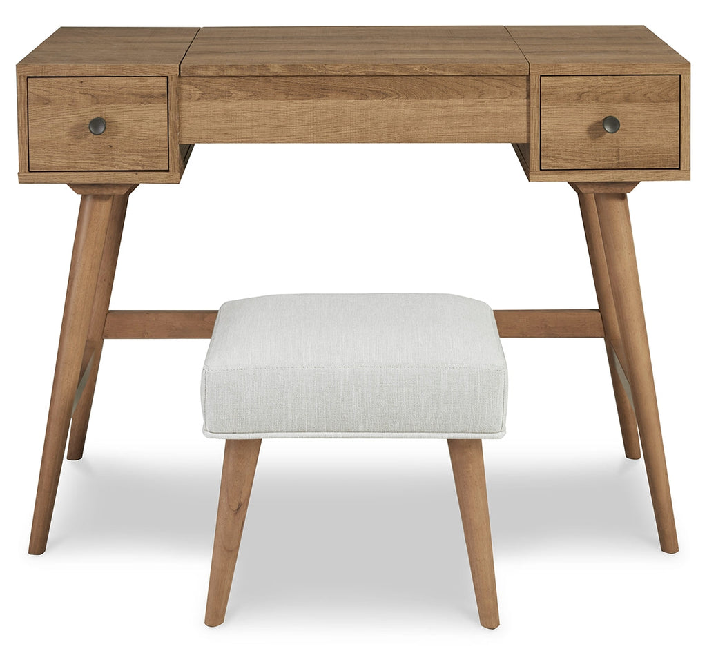Whether in a teen’s room, master bedroom or dressing area, the mid-century inspired design of this vanity set in light brown is packed with possibilities. The flip-top design makes it doubly handy as a vanity or writing table; flip it up for access to hidden storage and a mirror, and flip down for a flat work surface. Two smooth-gliding drawers offer additional storage for makeup and beauty essentials, while the sumptuously upholstered seat makes the experience complete.