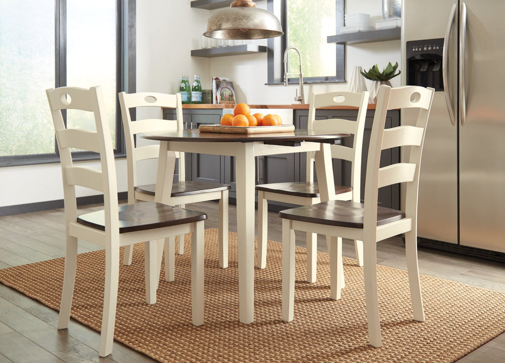 Turn your eat-in kitchen or dining space into a cottage-chic retreat with this round drop leaf table. Two-tone finish serves up a double helping of charm. When accompanied by the matching ladderback chairs, what a storybook scene.