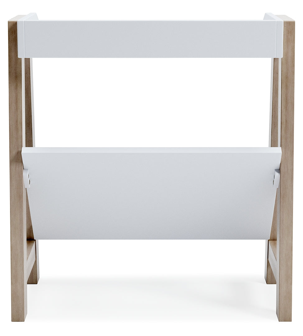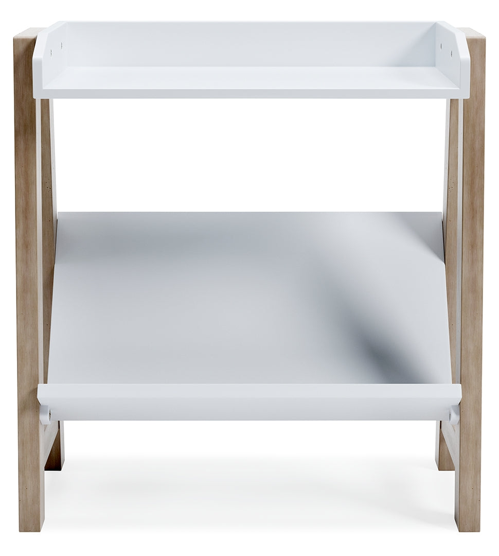 Whether for storage or display, this stylish small bookcase provides the perfect place to prop their ever-expanding book collection. The unique angled lower shelf and gallery rail top in white charmingly contrast with the light tan frame, creating a versatile piece ideal for small spaces.