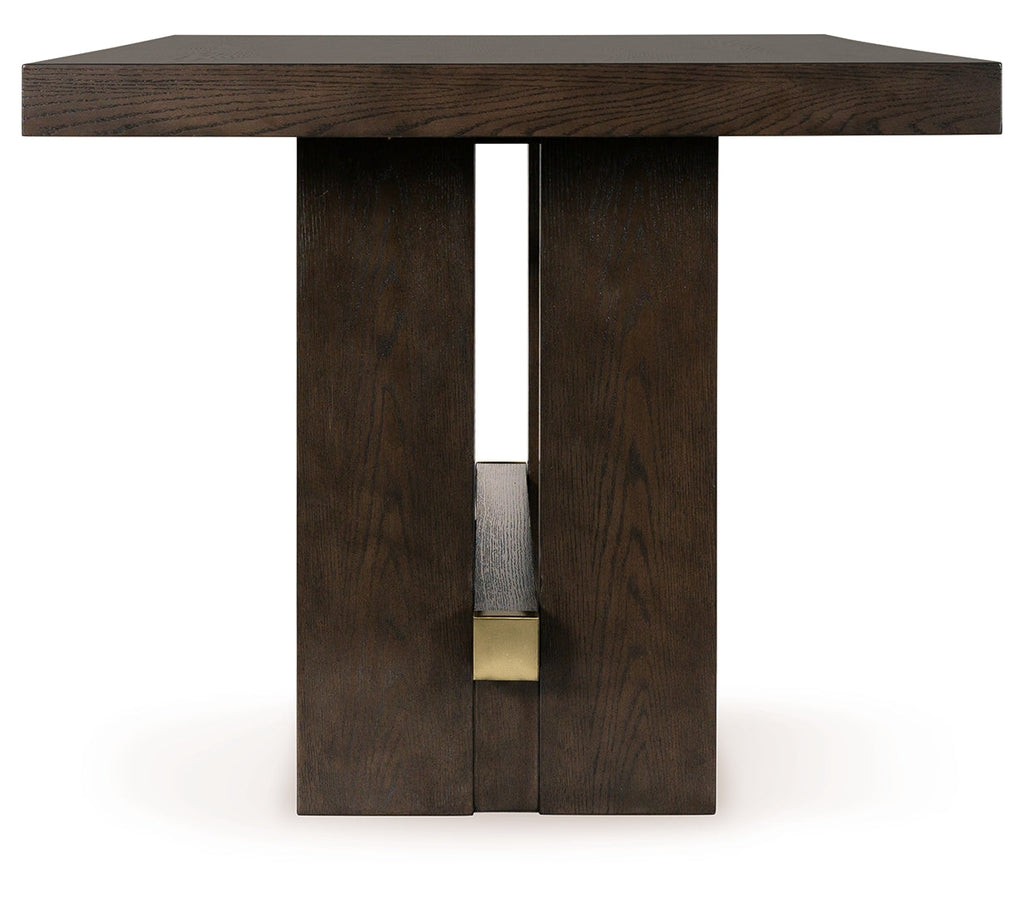 Dressed to thrill, this counter height dining table offers a high-design look at a down-to-earth price. Ultra-sleek lines are accentuated with a dark waxy brown oak-tone finish that’s so easy on the eyes. A thick tabletop and a pedestal base with integrated wine rack showcase quality craftsmanship and attention to detail. Clean-lined and modern, this timeless table has a look that’s made to last.