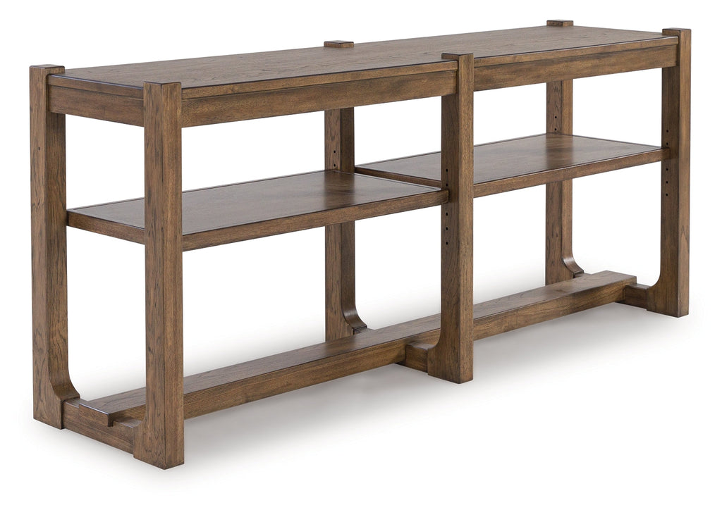 This sofa table sits comfortably at the intersection of modern lodge and farmhouse aesthetics. Your warm and welcoming disposition is reflected in the charming architectural elements and light brown glazed finish. Even with its poise, this table remains practical. With its multifunctional design, it doubles as a stunning TV stand or as a bookcase in the office.
