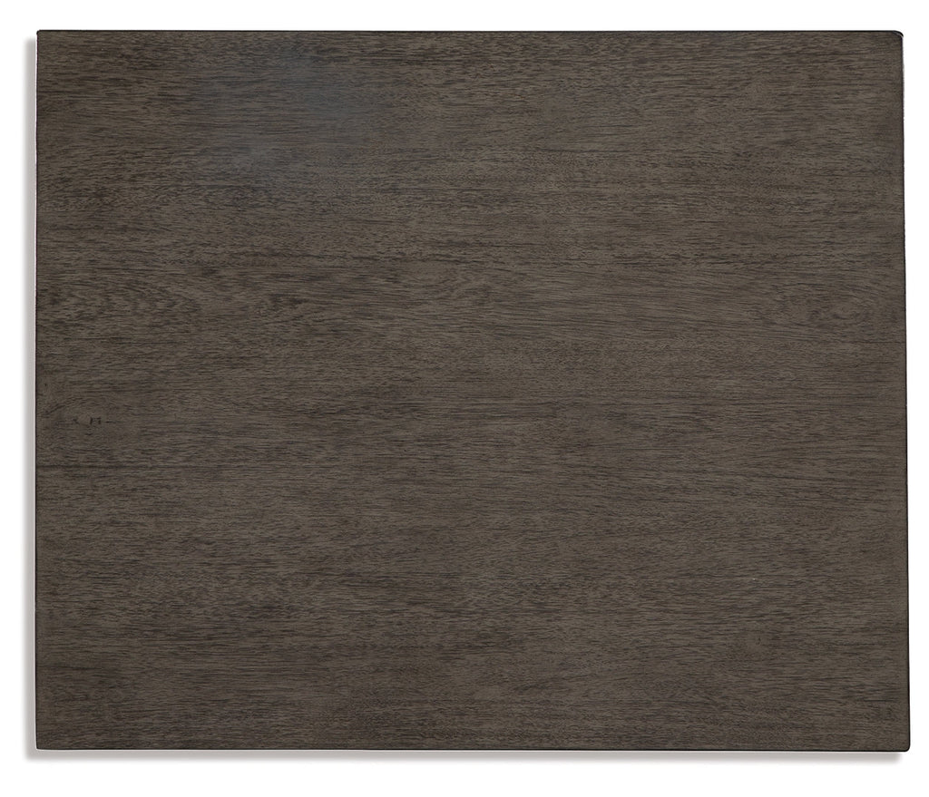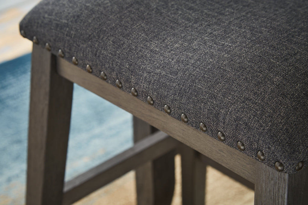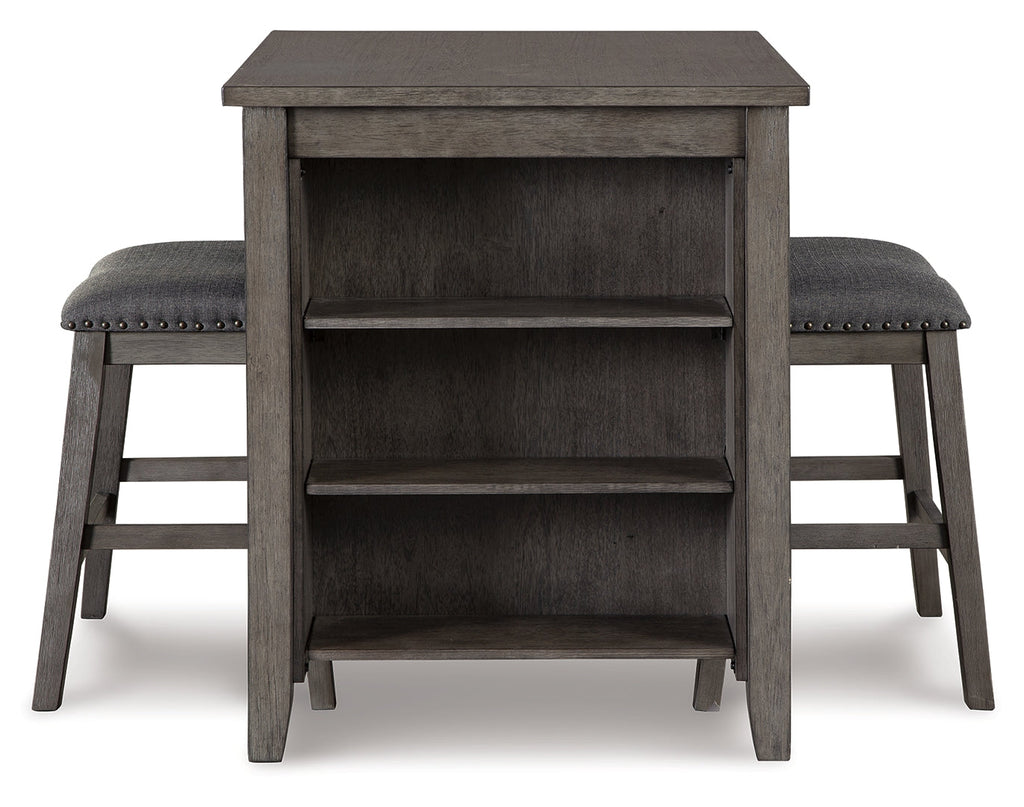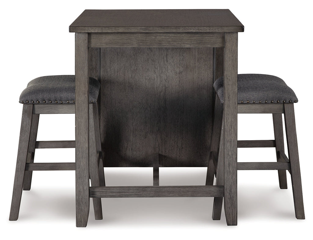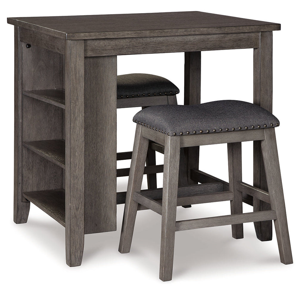 Perfect portion. Striking a simply chic pose, this counter height dining room table set serves up high style on a smaller scale. Its antiqued gray wash finish gives the clean-lined design a casually cool sensibility. Ideally sized for dinner for two or as an impromptu workspace, side shelves cleverly balance form and function. Covered in a textured gray fabric, the stool’s cushioned seat goes easy on the body.