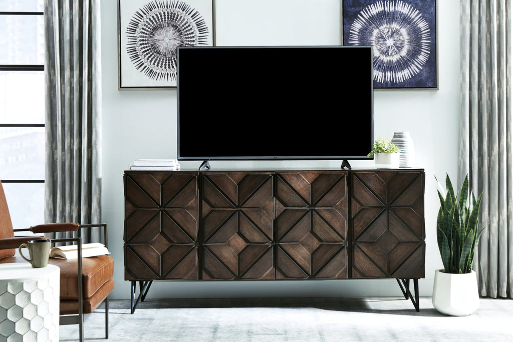 Entertain the possibilities with this extra large TV stand. Proving that furniture can be an art form, this sleek, chic cabinet stand—which accommodates up to 75" TVs—stands out from the crowd with a geometric overlay design that incorporates so much dimension. Adjustable shelving and cutouts for wire management make it highly accommodating. What's more, this TV stand works equally well as a dining room server or entryway console. How's that for staying power?