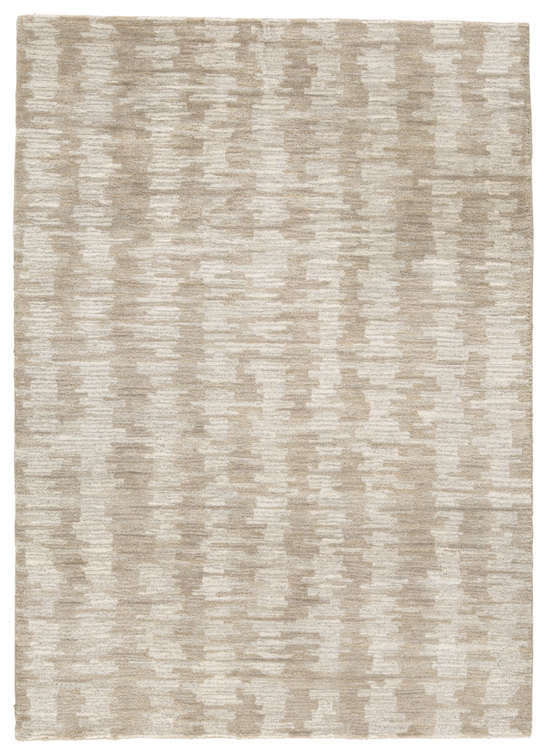 The hand-tufted modern design of this area rug will make a bold statement in any room. By alternating the pattern flow, the weavers have created a work of art alive with texture. Shades of cream and brown are blended to produce an abstract-yet-tranquil feel underfoot.