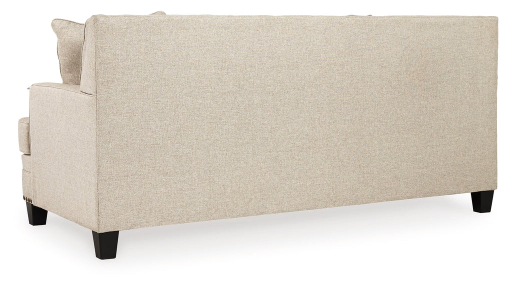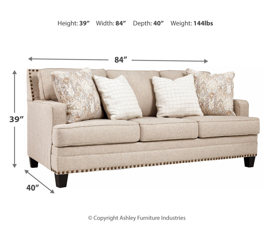 A case of contemporary and classic style influences coming together in a beautiful way, this sofa in beige brings a fresh perspective to modern farmhouse living. Distinctive elements include t-cushions that wrap around setback track arms, nailhead trim and a lovely linen-weave upholstery for an up-to-date feel. Muted hue designer throw pillows master the art of subtlety.