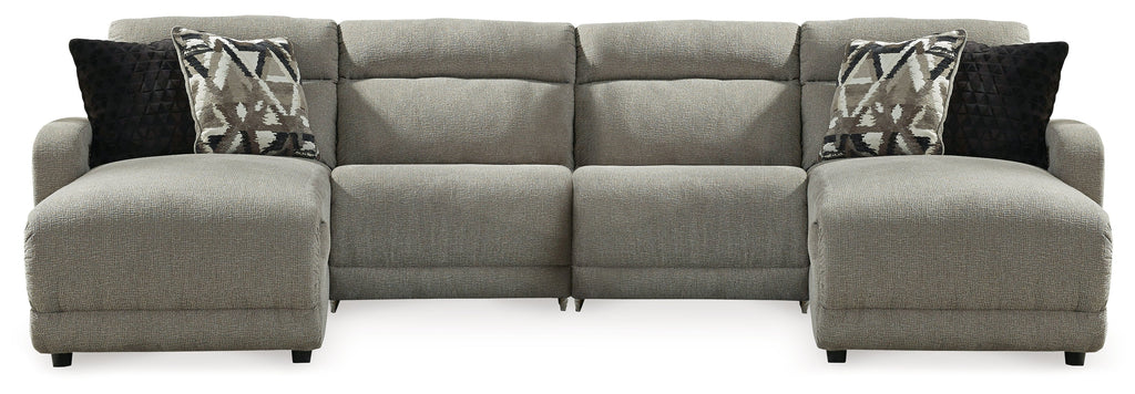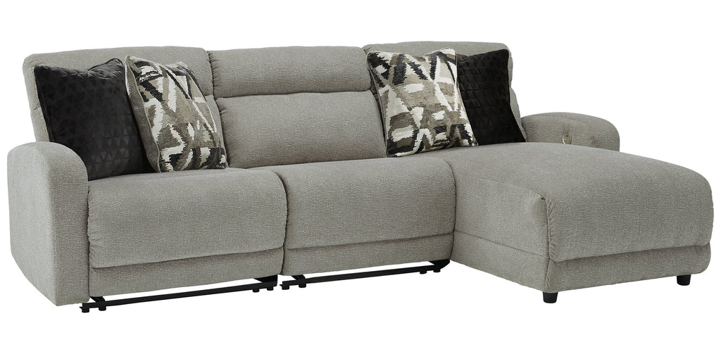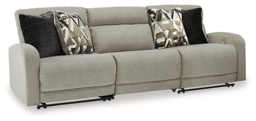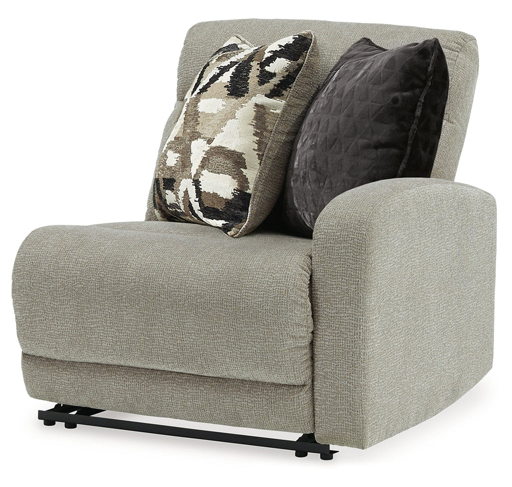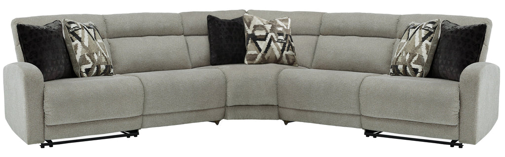 Delightfully modern. Exceptionally comfortable. When it comes to modular furniture with easy-elegant appeal, it’s hard to beat this power reclining sectional. Wrapped in a decadently plush stone-tone fabric for neutral versatility, this chic sectional is dressed to impress with a clean-lined divided back, curved track arms and a low-profile back for a relaxed, contemporary aesthetic.