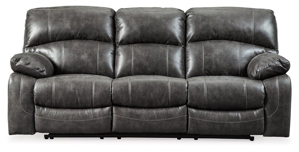 There is power in beauty with this power reclining sofa. Handsome crackle effect in the upholstery gives the appearance of supple leather but this recliner is all about the warmth of fabric. Contrast jumbo stitching adds a stylish touch. Double stuffed armrests cuff your body in comfort. Adjust your head and recline back with one easy touch.