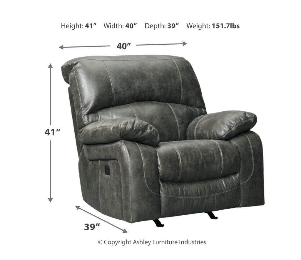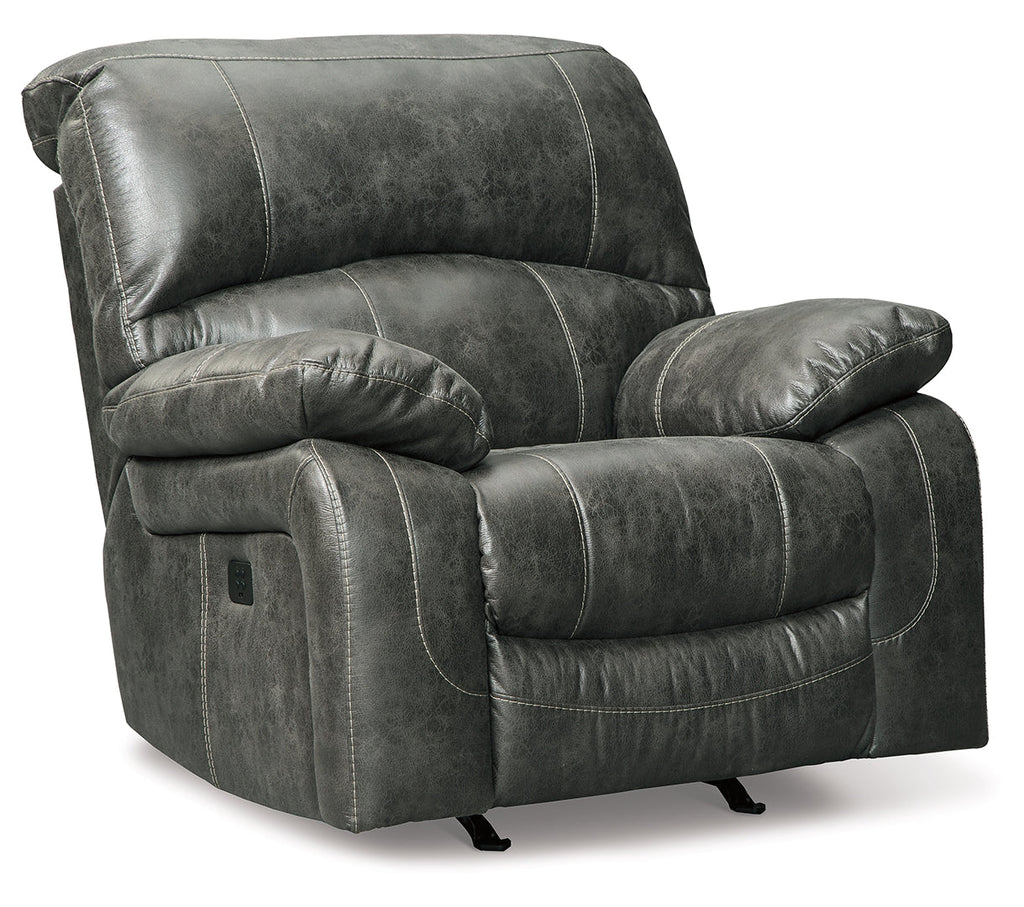 There is power in beauty with this power rocker recliner. Handsome crackle effect in the upholstery gives the appearance of supple leather but this recliner is all about the warmth of fabric. Contrast jumbo stitching adds a stylish touch. Double stuffed armrests cuff your body in comfort. Adjust your head and recline back with one easy touch.