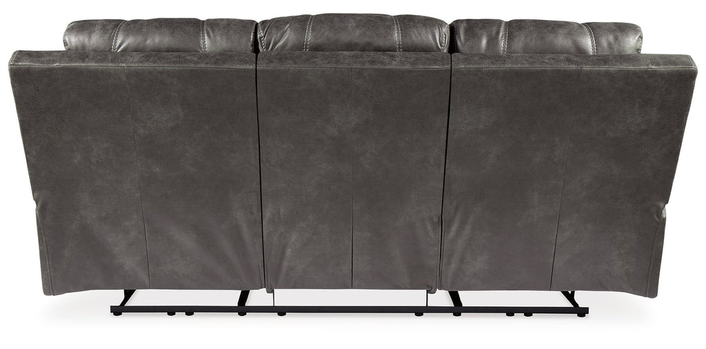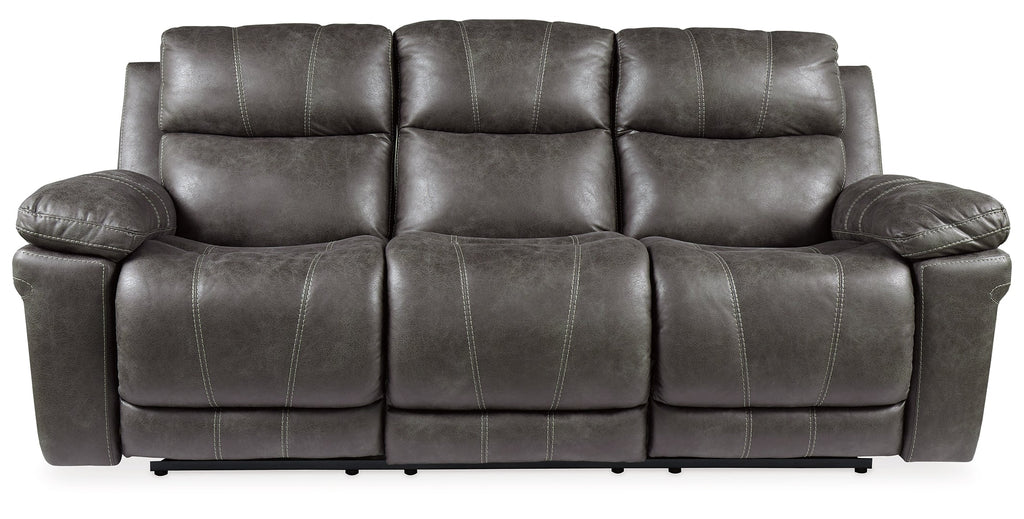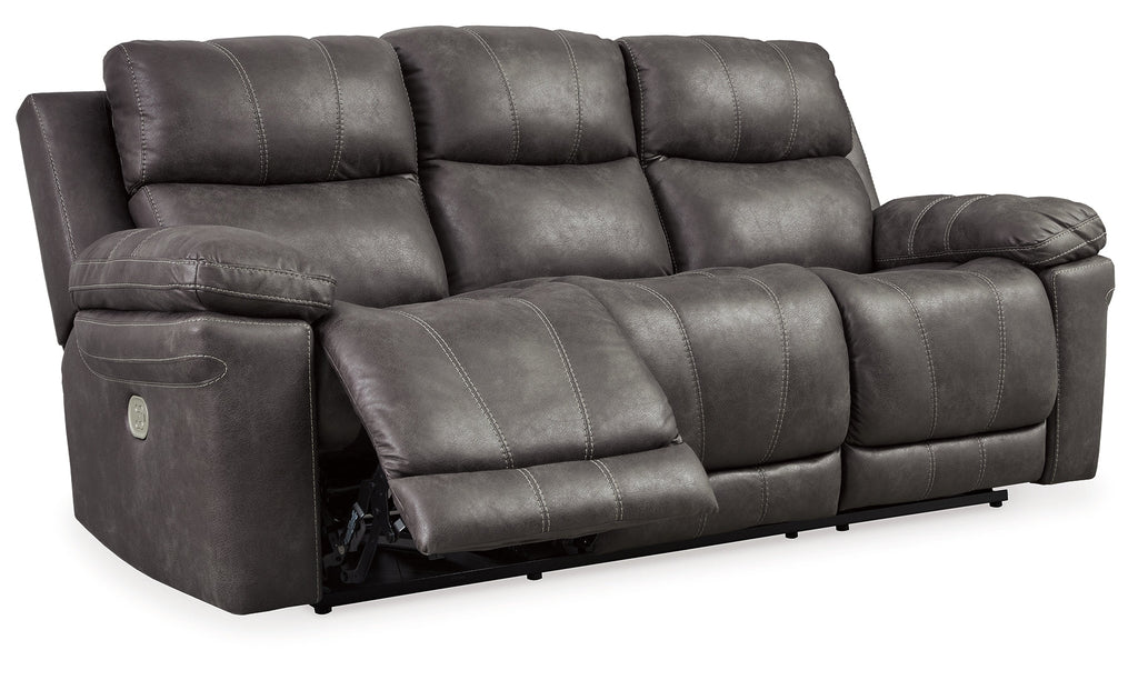 Coming in hot! Discover this power reclining sofa. Top-of-the-line faux leather fabric gives you the upscale look you want for less. Not to mention it feels incredible. Take a seat and raise your legs with one easy push of a button. The extended ottomans provide extra lengths for leg comfort. Want to watch TV or read in comfort? Easily fix your view with the power adjustable headrest. Complete with dramatic, jumbo stitching, this piece is out to capture your heart with style and comfort.
