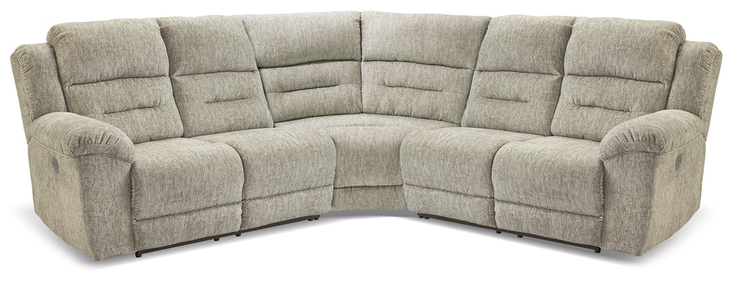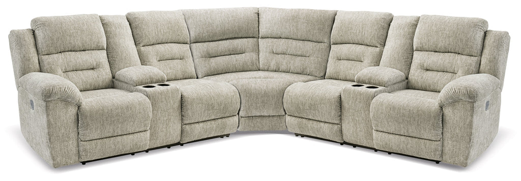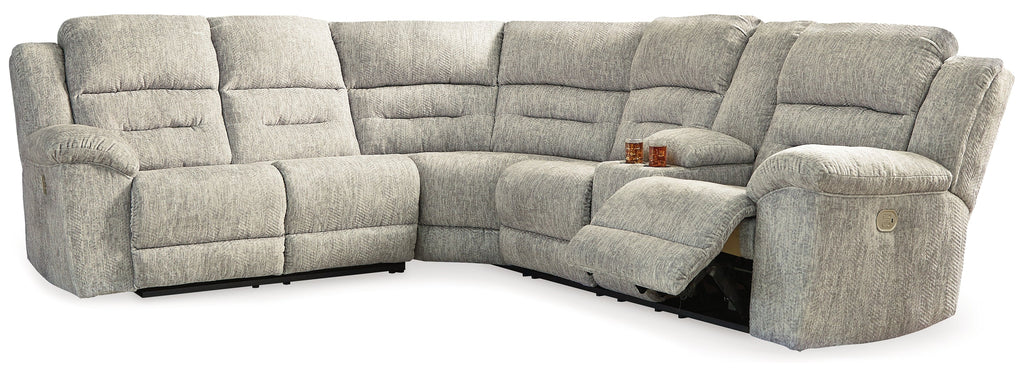 - Includes 3 pieces: left-arm facing power reclining loveseat with console, right-arm facing power reclining loveseat and wedge