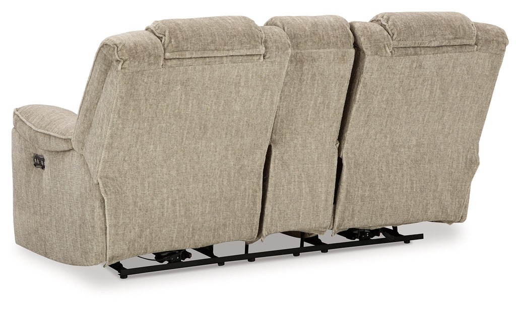 Change can be a good thing—especially when it takes lounging to a whole new level. Covered in high-pile fabric with rich tonal variation, this power reclining sofa cradles you in comfort. And if you're looking for convenience and connection (plus a touch of ambiance), this seating sports USB charging, a center storage console and a blue LED backlight.