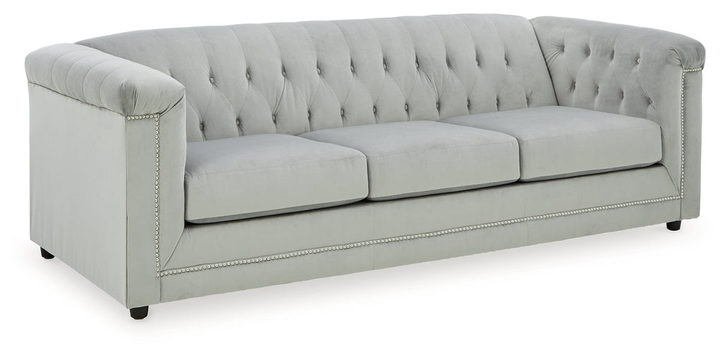With a timeless classic Chesterfield styling that's very much in vogue, this sofa makes a brilliant statement. Its beautifully neutral silvery gray velvet fabric looks as good as it feels. Nailhead trim, button tufting and high shelter arms give the sofa an effortlessly elegant appeal. The hidden leg design is an on-trend addition for modern spaces.