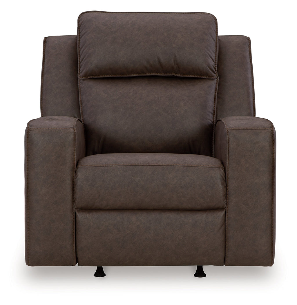 Indulge your lust for comfort and love for contemporary design with this rocker recliner. Made for easy everyday living, it’s upholstered in a heavyweight padded faux leather and accented with contrast jumbo stitching for fashion-forward flair. Sleek track arms elevate the look with a touch of modern sensibility.