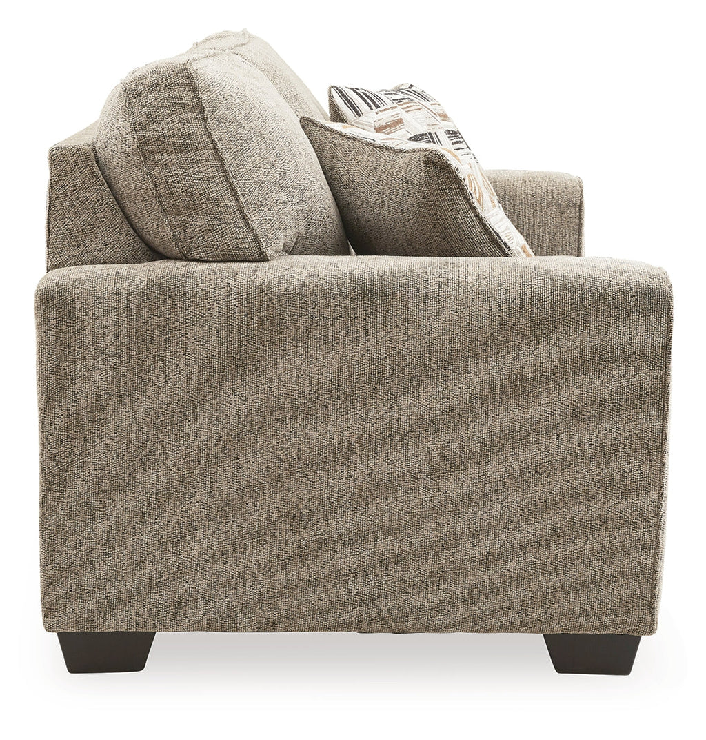 For seating that feels as good as it looks, the choice is clear. This loveseat has a neutral mocha hue that blends effortlessly with any room decor and color scheme. Its soft textured chenille fabric with chevron effect beckons you to sit and relax. Wide track arms elevate the look with a touch of contemporary sensibility, enticing you to settle in and stay awhile. Caramel and black toss pillows are a designer favorite.