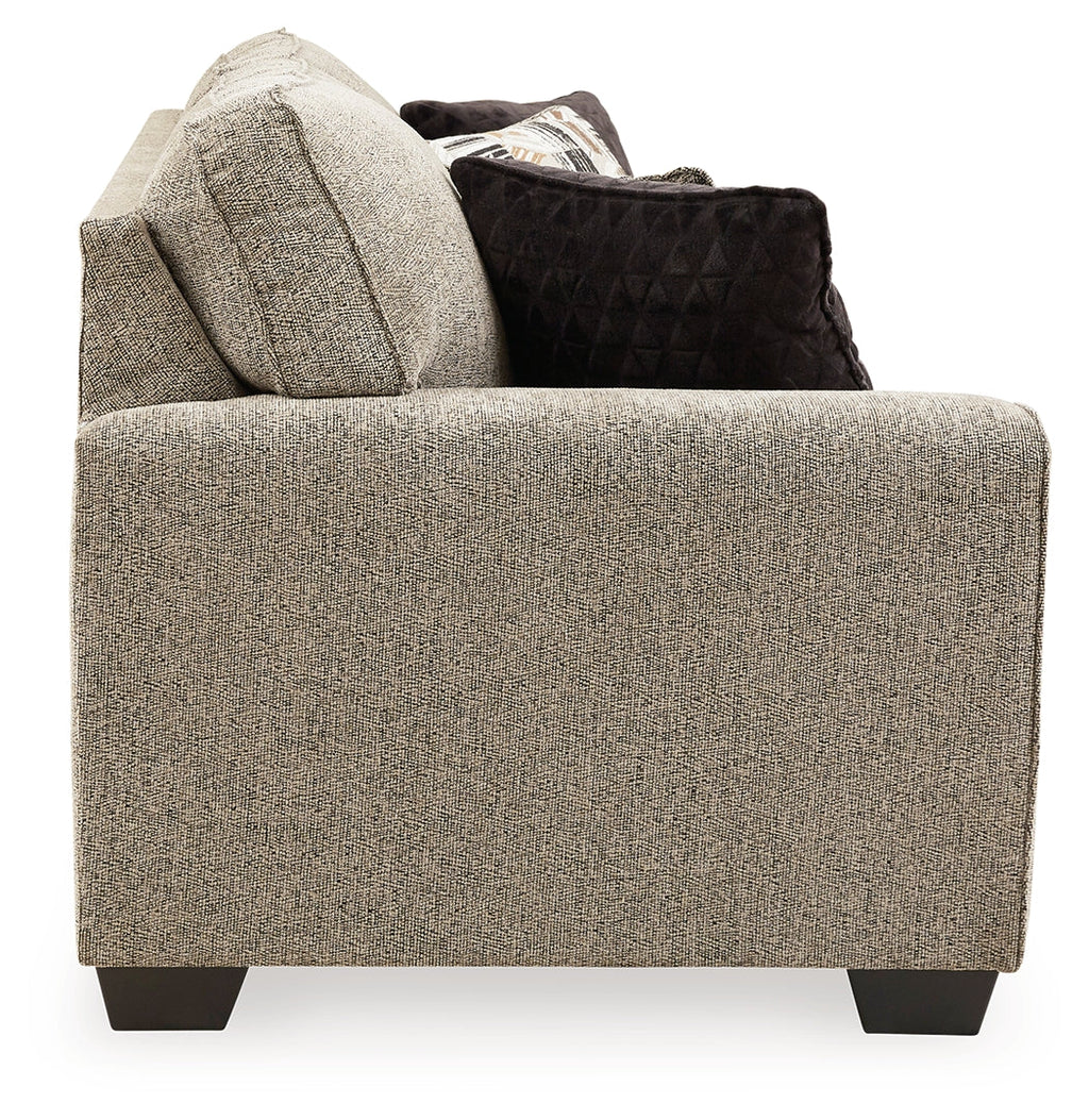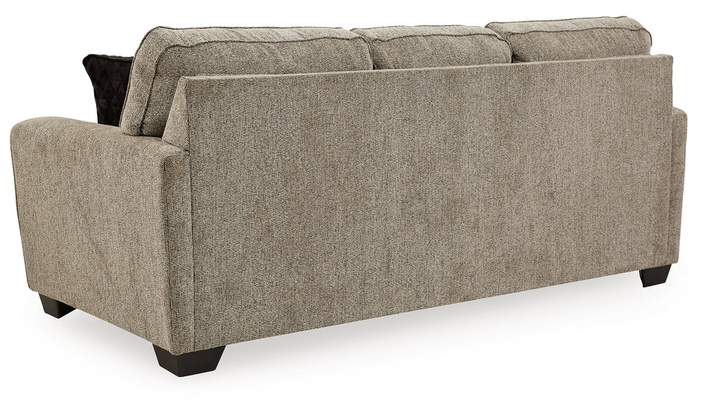 For seating that feels as good as it looks, the choice is clear. This sofa has a neutral mocha hue that blends effortlessly with any room decor and color scheme. Its soft textured chenille fabric with chevron effect beckons you to sit and relax. Wide track arms elevate the look with a touch of contemporary sensibility, enticing you to settle in and stay awhile. Caramel and black toss pillows are a designer favorite.