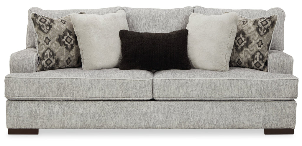 An indulgent choice with deep seats crafted for ultra-plush softness, this designer sofa is the ideal merger of modern flair and classic staying power. If you love a touch of texture, you’re sure to appreciate this sofa’s gorgeous gray upholstery with subtle chevron effect. Posh toss pillows layered over the loose back cushions perfect the richly relaxed aesthetic.
