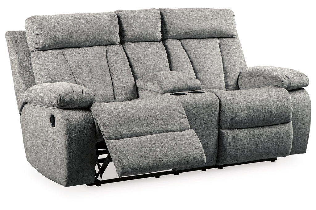 Bring your snacks and beverages and plan for a night with your feet up. This double reclining loveseat is plush in all the right places, and will support you longer than you can binge watch your favorite TV show. The neutral upholstery is ready for a patterned throw blanket and some of your time. Hide the remote in the console and claim your spot on the Mitchiner.