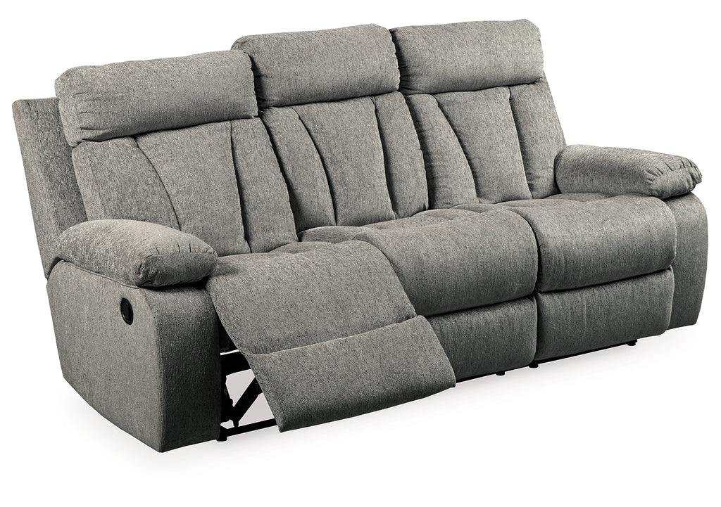 Your to-do list is complete, now it’s time for ultimate relaxation. This double reclining sofa is plush in all the right places, and will support you for longer than you can binge watch your favorite TV show. The neutral upholstery is ready for a patterned throw pillow and some of your time. The middle seat’s back drops down into convenient table top with cup holders, the perfect resting spot for tablets and magazines.
