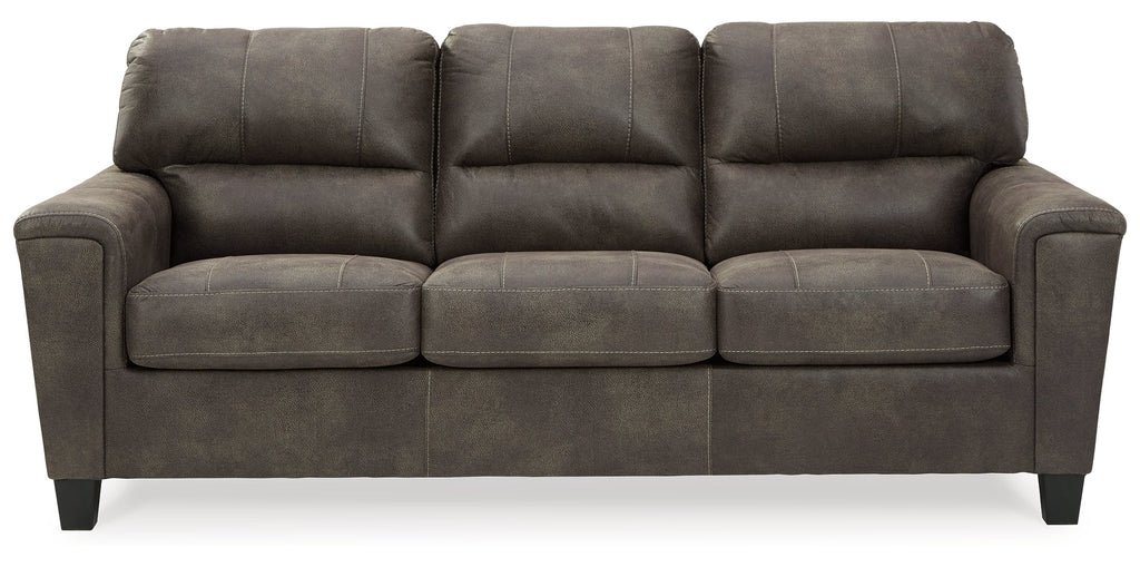 If you love the cool look of leather but long for the warm feel of fabric, you can take comfort in this queen sofa sleeper. Wrapped in a fabulous faux leather with a weathered hue and hint of pebbly texture to resemble the real deal, this decidedly modern sofa proves less is more. Elements include angled side profiling and track armrests wrapped with a layer of pillowy softness for that little something extra. Prominent jumbo stitching and clean-lined divided back styling lend fashion-forward flair. Rest assured, the queen memory foam mattress comfortably accommodates overnight guests.