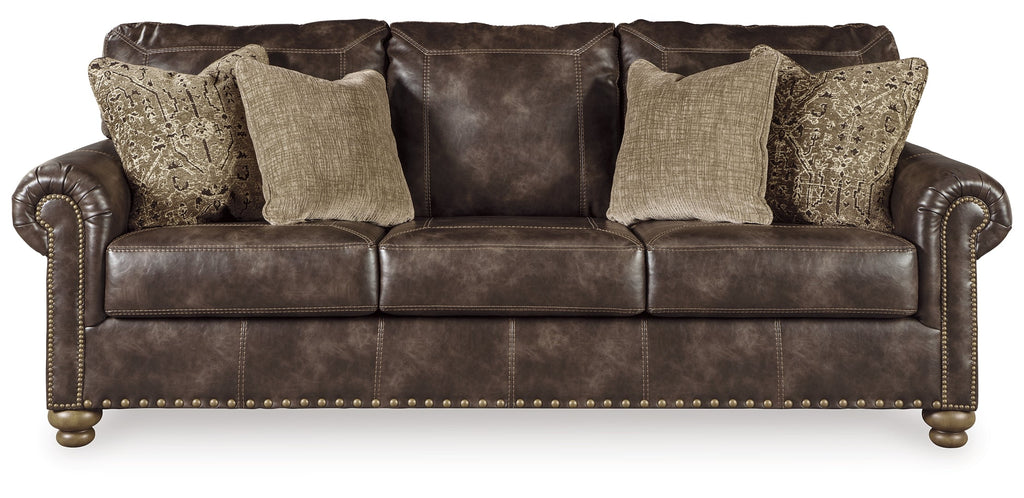 Enticing with a coffee brown faux leather, beautified with a gently weathered effect and designer stitching, this sofa merges a richly traditional sense of style with modern comfort. Roll arms, turned bun feet and prominent nailhead trim incorporate distinctive character. Four plush accent pillows are a sumptuous touch.